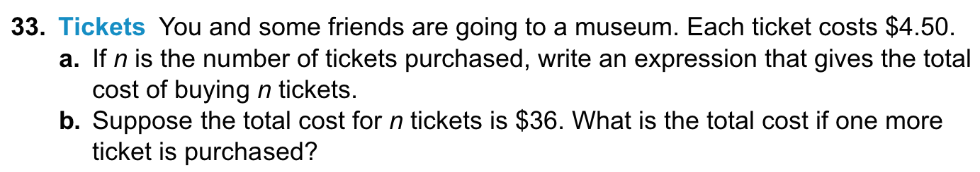 And the last one, Tickets. – the second part looks as though it is after some algebraic manipulation, but simple me says “n tickets cost $36, one more costs $4.50, so total cost is $40.50”