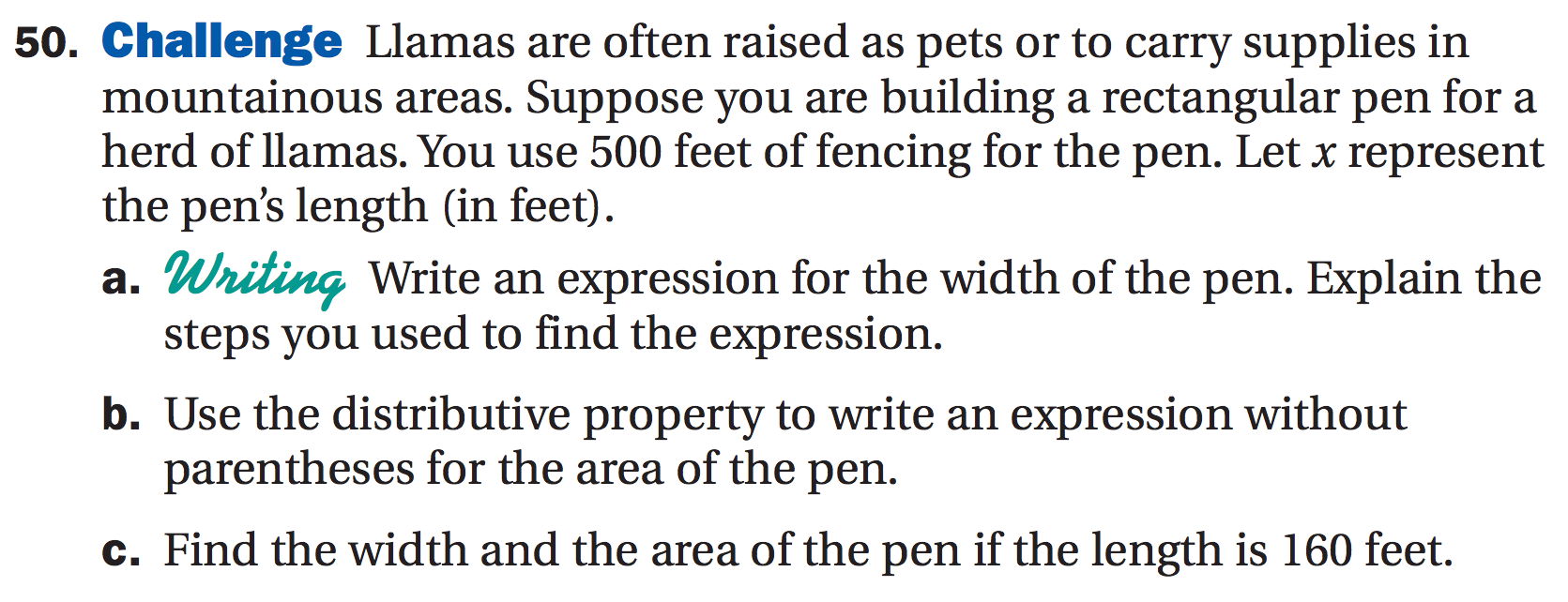 Llamas – problem has absolutely nothing to do with llamas, and “use the distributive property …..” which we used to call “expand the brackets (UK)”. What if the student said “half the fence for one side and one end, so they get width = 250 – x, and cannot answer the second bit.